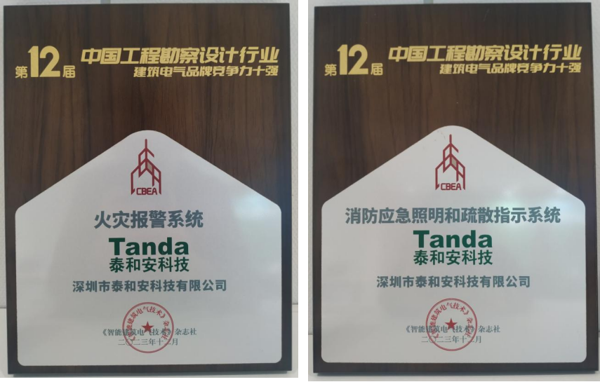 12月15日,中國建筑節能協會電氣分會2023年會在蘇州召開,會中發布了由中國勘察設計協會電氣分會、中國建筑節能協會電氣分會主導的《第十二屆中國工程勘察設計行業?建筑電氣品牌競爭力十強》評選結果,泰和安分別榮獲“火災報警系統”、“消防應急照明和疏散指示系統”品牌競爭力十強。