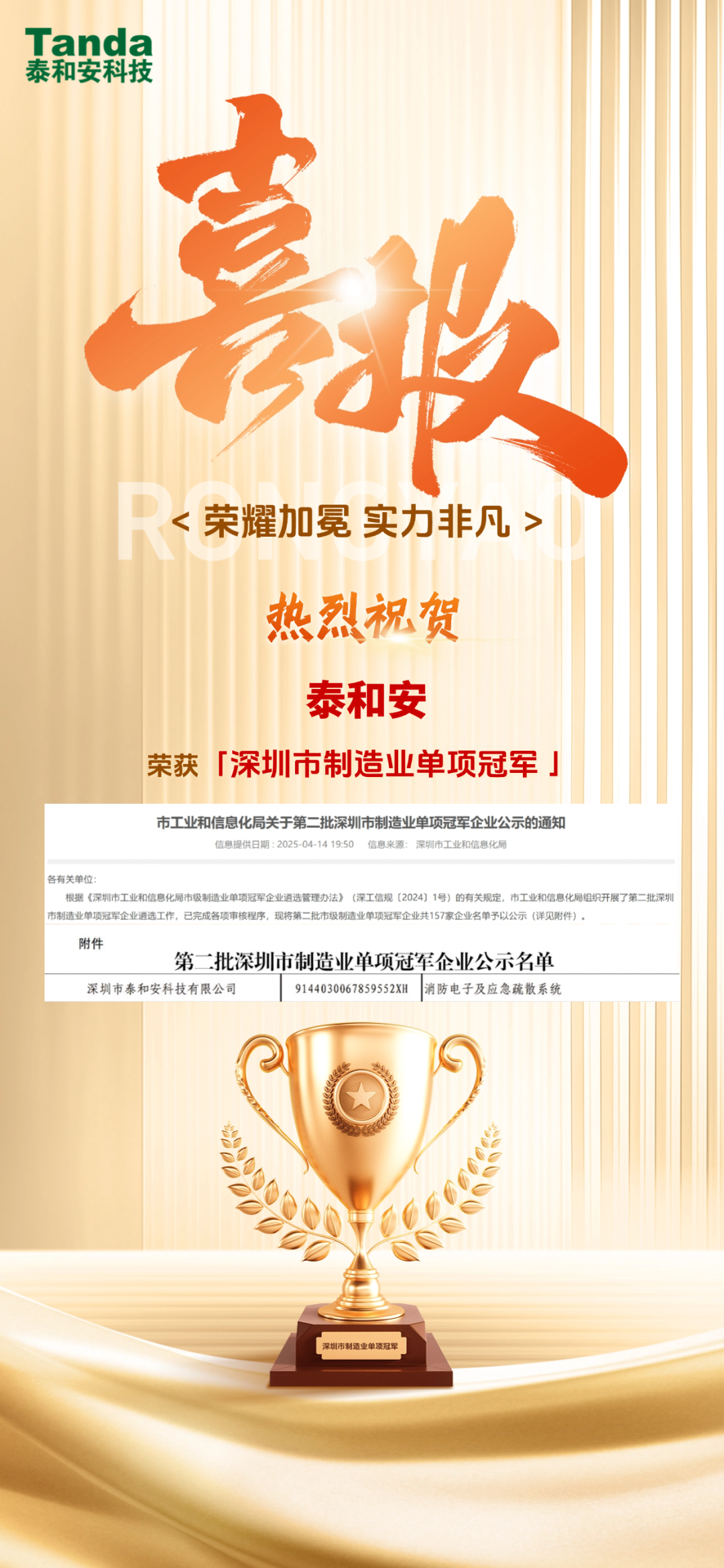 再獲殊榮|泰和安榮獲制造業單項冠軍!